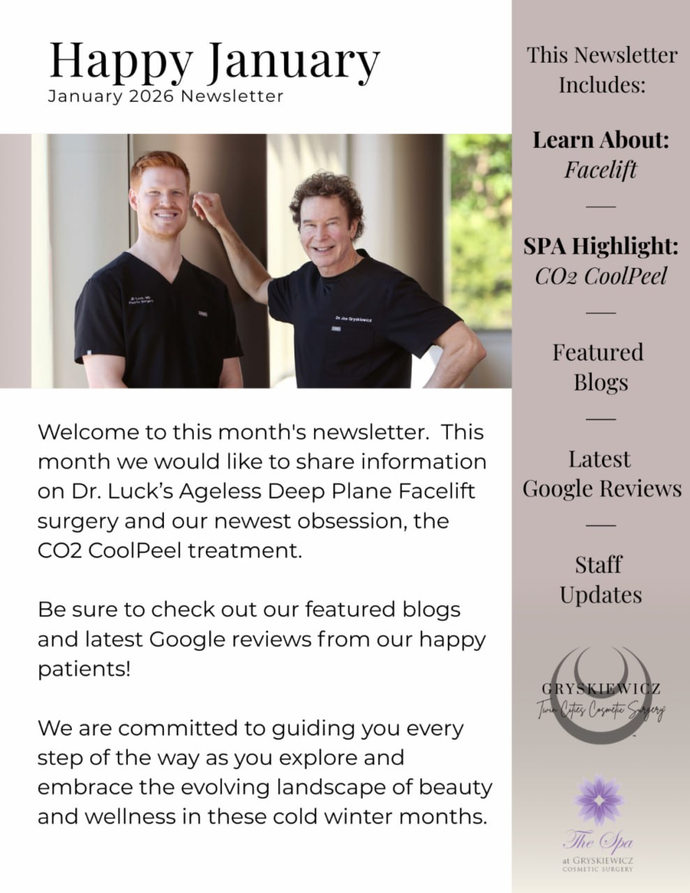 Welcome to the Gryskiewicz Twin Cities Cosmetic Surgery ® Newsletter Library—your trusted source for expert insights, cutting-edge advancements in surgical and non-surgical cosmetic procedures, and inspiring patient success stories. Whether you’re exploring treatment options or simply passionate about aesthetics, our newsletters offer the knowledge and guidance you need to make informed, confident decisions about your journey. Browse our past editions below, and subscribe today to stay ahead of the latest in beauty and innovation!